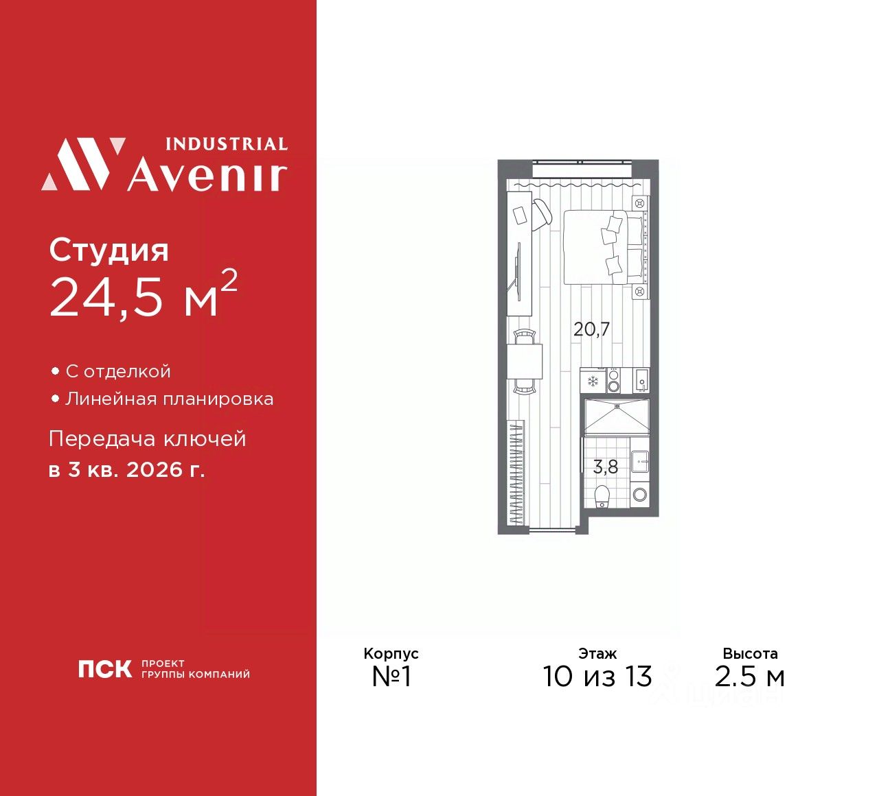 Продаются однокомнатные апартаменты-студия с отделкой в ЖК "Industrial AVENIR" на 10 этаже. Общая площадь: 24.5 кв.м., площадь гостиной 20.7 кв.м., из которых 5 кв.м. выделено под кухонную зону. Все окна выходят на одну сторону. В апартаментах один совмещенный санузел. Высота потолков 2.5 м.