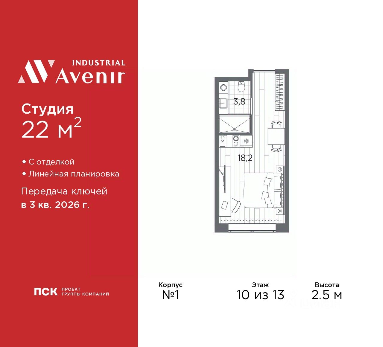 1-комн. апартаменты-студия с отделкой в ЖК "Industrial AVENIR" на 10 этаже. Общая площадь: 22 кв.м., площадь гостиной 18.2 кв.м., из которых 5 кв.м. выделено под кухонную зону. Все окна выходят на одну сторону. В апартаментах один совмещенный санузел. Высота потолков 2.5 м.