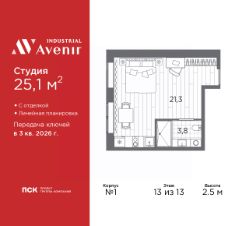 Продаются 1-комн. апартаменты-студия с отделкой в ЖК "Industrial AVENIR" на 13 этаже. Общая площадь: 25.1 кв.м., площадь гостиной 21.3 кв.м., из которых 5 кв.м. выделено под кухонную зону. Все окна выходят на одну сторону. В апартаментах один совмещенный санузел. Высота потолков 2.5 м.