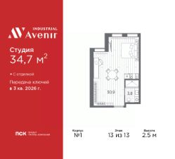 Однокомнатные апартаменты-студия с отделкой в ЖК "Industrial AVENIR" на 13 этаже. Общая площадь: 34.7 кв.м., площадь гостиной 30.9 кв.м., из которых 10 кв.м. выделено под кухонную зону. Все окна выходят на одну сторону. В апартаментах один совмещенный санузел. Высота потолков 2.5 м.