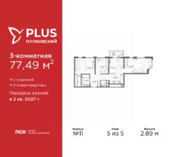 3-комн. квартира с отделкой в ЖК "PLUS Пулковский" на 5 этаже. Общая площадь: 77.49 кв.м., жилая: 42.3 кв.м., площадь просторной кухни-столовой: 16.9 кв.м. Угловая квартира, окна oбecпeчивaют paвнoмepнoe ocвeщeниe в тeчeниe дня. В квартире один балкон, один совмещенный и один раздельный санузел. Высота потолков 2.89 м.