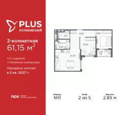 Просторная 2-комн. квартира с отделкой в ЖК "PLUS Пулковский" на 2 этаже. Общая площадь: 61.15 кв.м., жилая: 21.1 кв.м., площадь просторной кухни-столовой: 20.2 кв.м. Комнаты изолированные, все окна выходят на одну сторону. В квартире одна лоджия, один совмещенный и один раздельный санузел. Высота потолков 2.89 м.