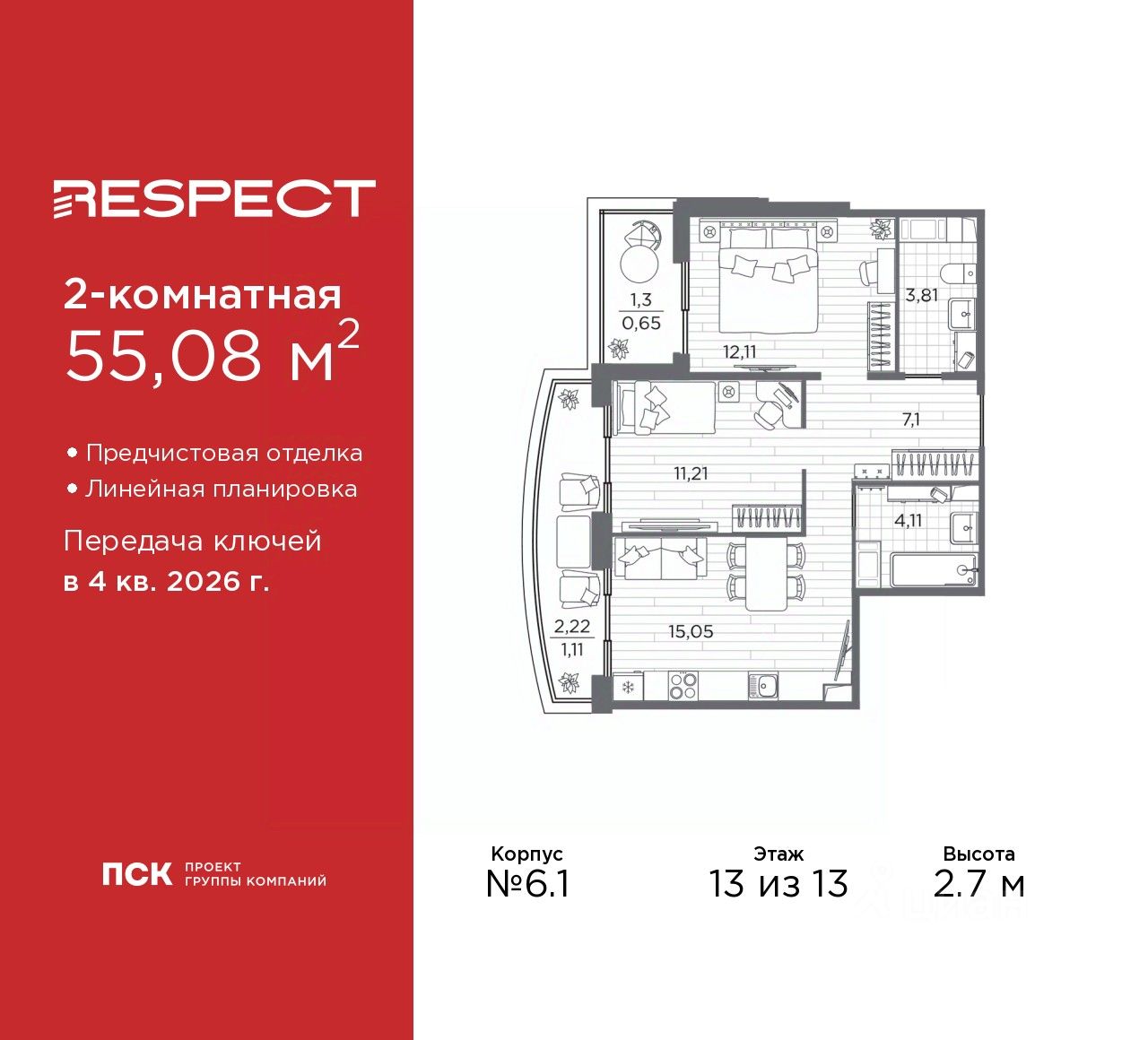 2-комн. квартира с предчистовой отделкой в ЖК "RESPECT" на 13 этаже. Общая площадь: 55.08 кв.м., жилая: 23.32 кв.м., площадь просторной кухни-столовой: 15.05 кв.м. Комнаты изолированные, все окна выходят на одну сторону. В квартире один балкон и одна лоджия, два совмещенных санузла. Терраса представляет собой роскошную зону отдыха для проведение вечеров в кругу семьи и друзей или организация вечеринок. Высота потолков 2.7 м.