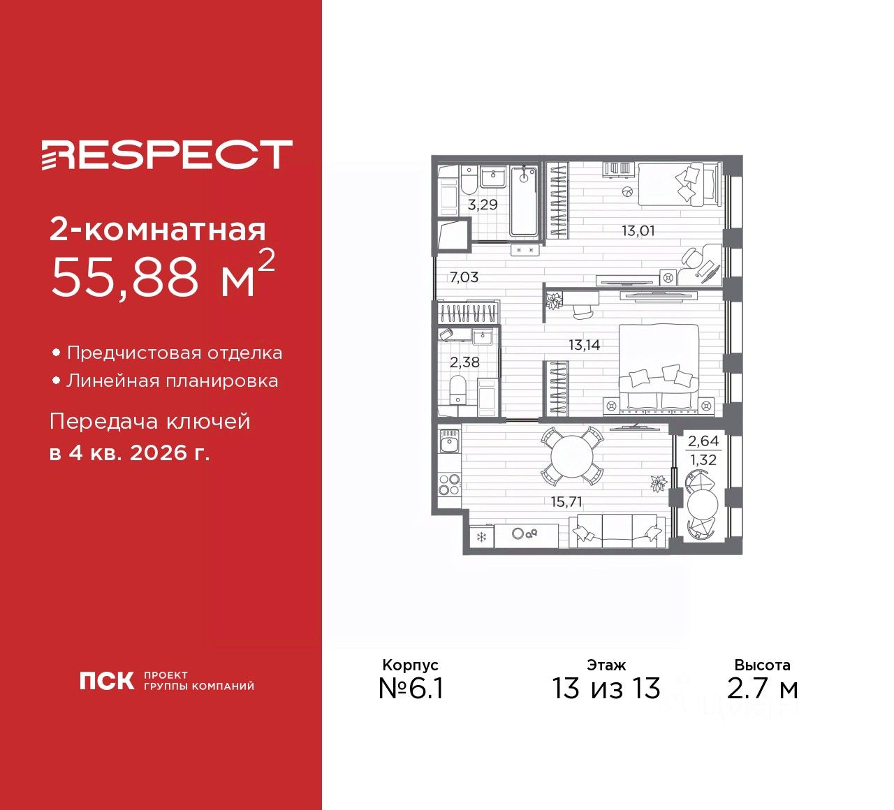 Продается 2-комн. квартира от застройщика с предчистовой отделкой в ЖК "RESPECT" на 13 этаже. Общая площадь: 55.88 кв.м., жилая: 26.15 кв.м., площадь просторной кухни-столовой: 15.71 кв.м. Комнаты изолированные, все окна выходят на одну сторону. В квартире одна лоджия, один совмещенный и один раздельный санузел. Высота потолков 2.7 м.