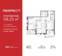 Продается 2-комн. квартира с отделкой в ЖК "RESPECT" на 5 этаже. Общая площадь: 59.25 кв.м., жилая: 25.34 кв.м., площадь просторной кухни-столовой: 17.44 кв.м. Квартира угловая, очень светлая, естественная вентиляция при открытии окон. В квартире две лоджии, один совмещенный и один раздельный санузел. Высота потолков 2.7 м.