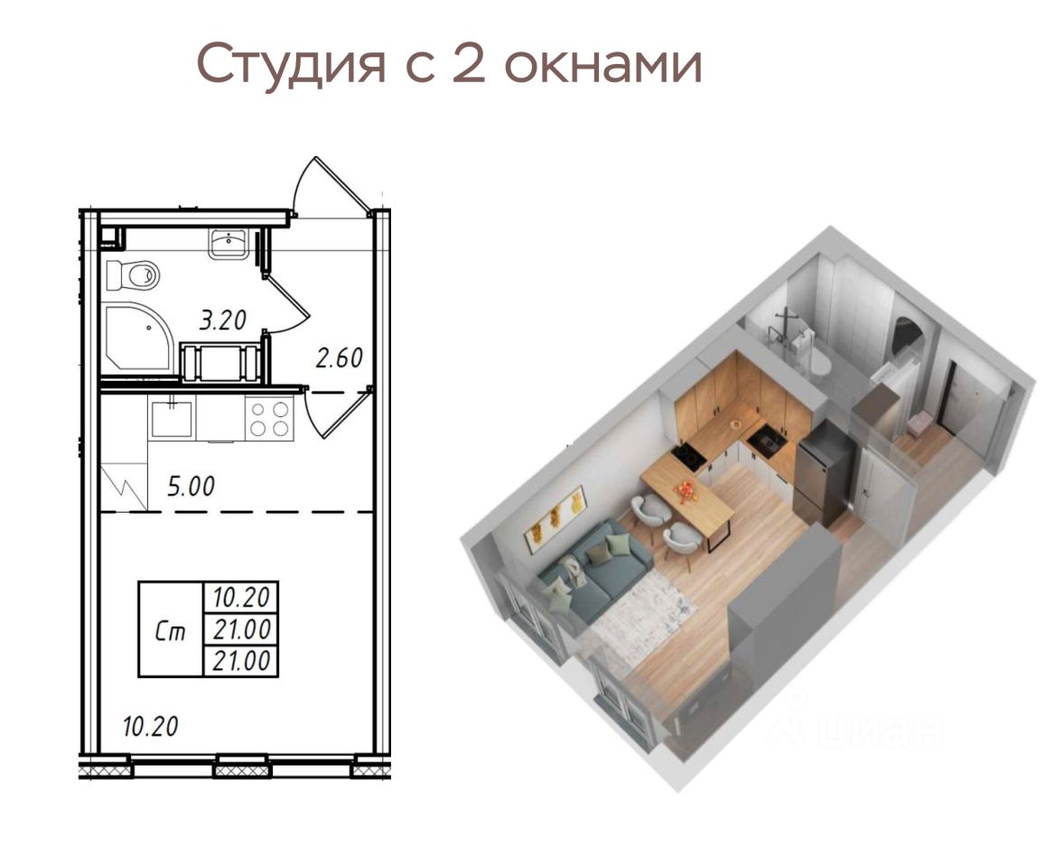 Два окна это залог отличного естественного освещения и свежего воздуха, а также возможность наслаждаться видами на природу и небо, что способствует расслаблению и полноценному отдыху. Квартира станет прекрасным домом для одного или двоих, а также для сдачи в аренду с высокой доходностью.