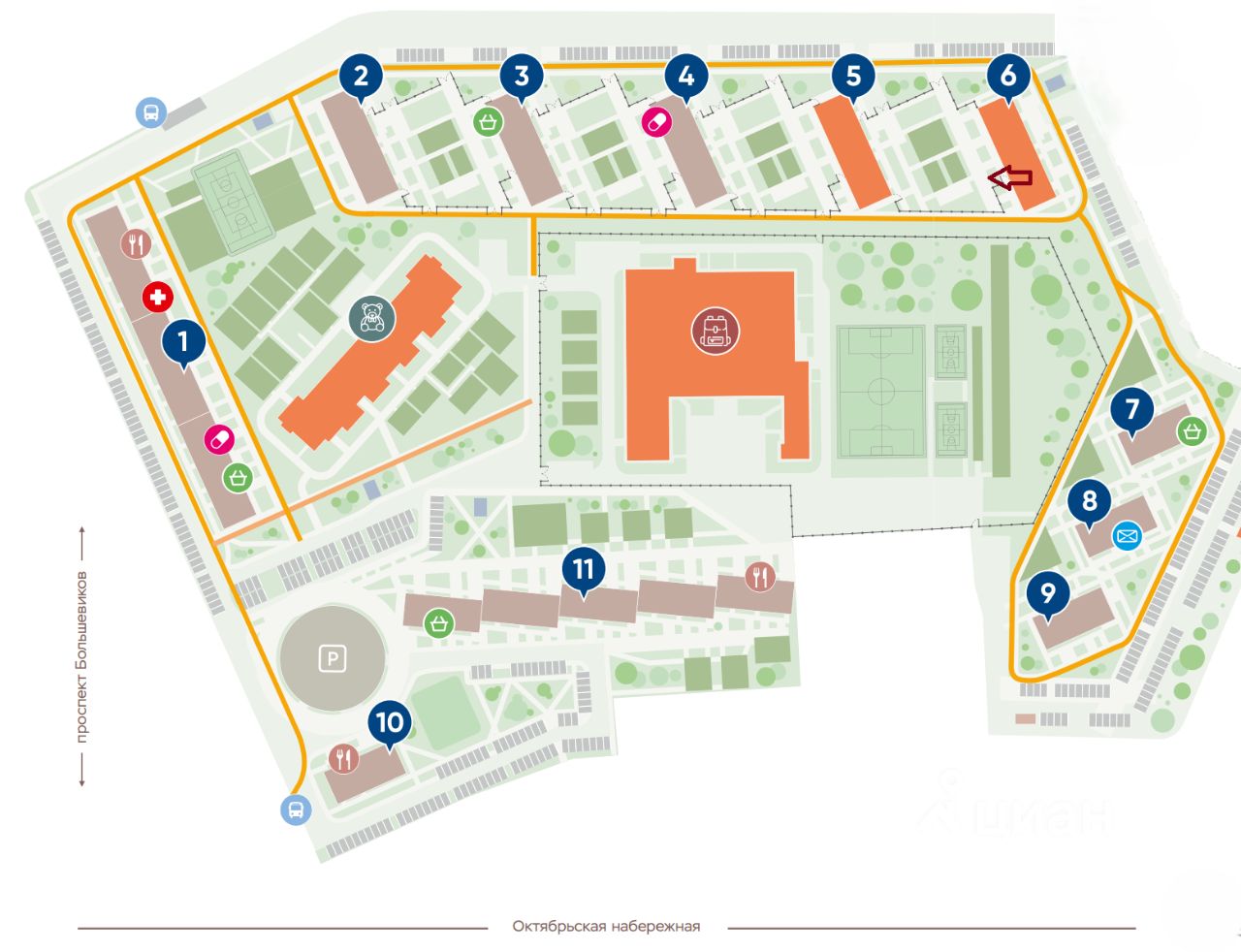 Превосходное расположение: Жилой комплекс расположен вблизи Большого Обуховского моста на пересечении пр. Большевиков и Октябрьской набережной. Рядом развязка КАД и остановки наземного транспорта. До ближайших станций метро Ломоносовская и улица Дыбенко — 10 минут на авто. До торгово-развлекательного комплекса Лондон Молл — 15 минут, и всего за 2 минуты можно добраться до набережной Невы