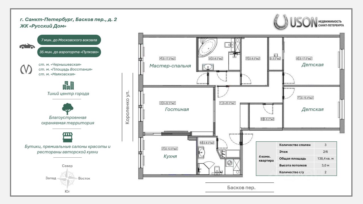 Продается 4-комнатная квартира с дизайнерским ремонтом в современном элитном жилом комплексе "Русский дом". ЖК расположен в тихой части исторического центра Санкт-Петербурга: в нескольких минутах ходьбы от Таврического сада, в непосредственной близости ст. м. "Чернышевская" / "Площадь Восстания" / "Маяковская".