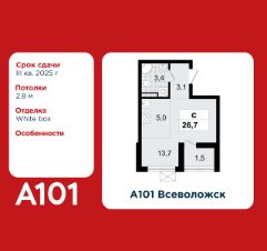 Студия площадью 26.70 в ЖК "А101 Всеволожск" c лоджией на 11 этаже. Квартира white box. Вид из окна во двор. В квартире 1 санузел. Высота потолков 2.8 м.