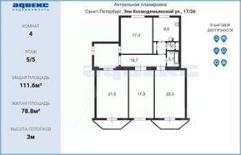 Общая площадь квартиры составляет 111,6 квадратных метров. Жилая площадь разделена на четыре комнаты, размеры которых составляют 22, 17,4, 21,3 и 7,9 квадратных метров соответственно. Кухня имеет площадь 9,6 кв.м. Высота потолков в квартире — 3 метра, что создаёт ощущение простора. Квартира расположена на пятом этаже пятиэтажного кирпичного дома. Для ванной зоны предусмотрен раздельный санузел. В квартире есть два балкона, окна выходят на две стороны, что обеспечивает хорошее естественное освещение и солнечное наполнение комнат. В остальном помещение требует ремонта. Установлена газовая плита.