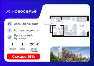 Продается квартира-студия на 1-м этаже в строящемся проекте комфорт-класса Новоселье. Общая площадь лота составляет 20,83 кв. м, из которых 10,24 кв. м отведено под жилую и 4,40 кв. м под кухонную зону. Номер квартиры - 5
