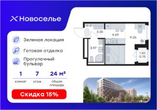Продается квартира-студия на 7-м этаже в строящемся проекте комфорт-класса Новоселье. Общая площадь лота составляет 24,02 кв. м, из которых 11,26 кв. м отведено под жилую и 4,69 кв. м под кухонную зону. Номер квартиры - 92