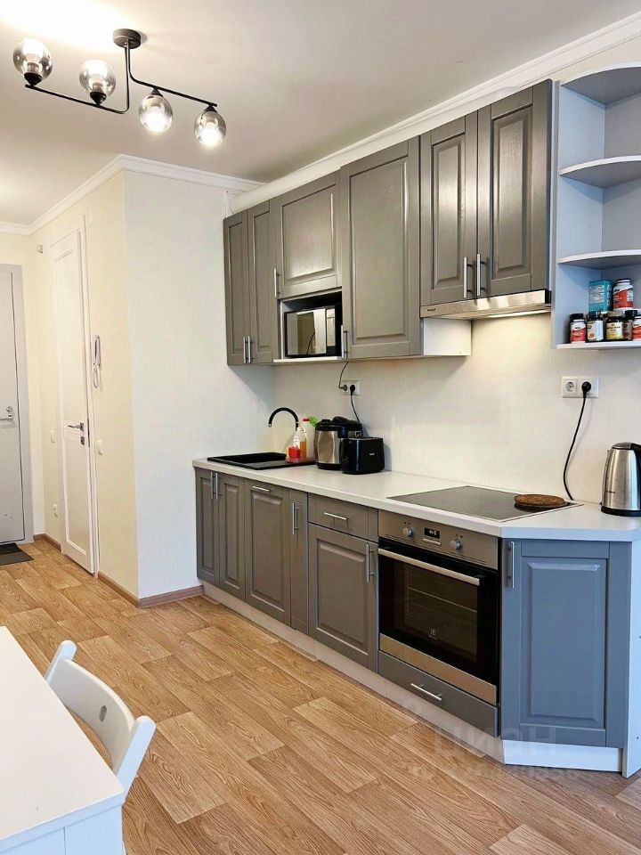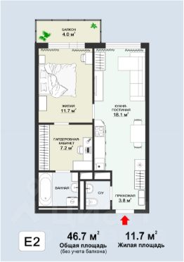 Одна изолированная комната-спальня, большая кухня-гостиная, небольшой изолированный кабинет-гардеробная,