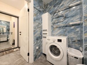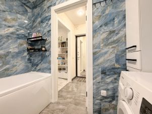 Санузел: Просторный и функциональный. Установлена ванная, унитаз и отдельно стоящая раковина (не над стиральной машиной). Стиральная машина остается вам, а также пенал, тумбочка под раковиной и несколько полочек для хранения белья и бытовой химии.