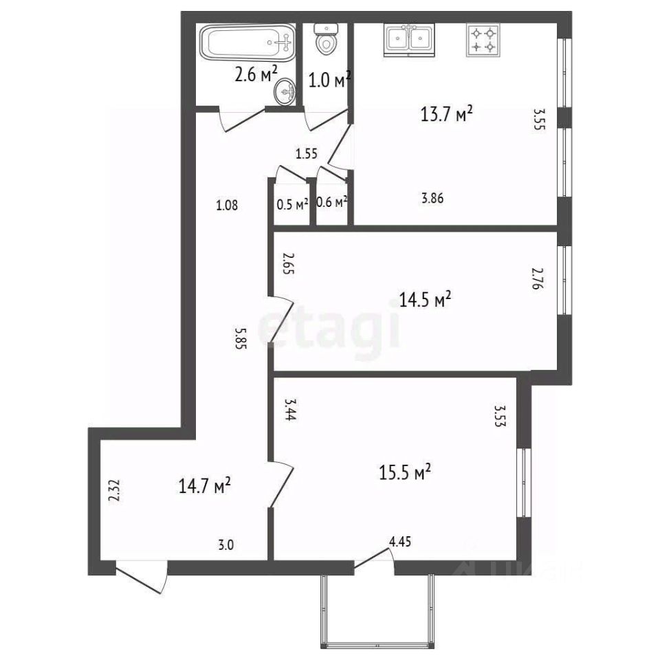 Большая 14-метровая кухня позволит хозяйке воплотить любою кулинарную фантазию, а вторая комната станет отличным местом отдыха после насыщенного дня.