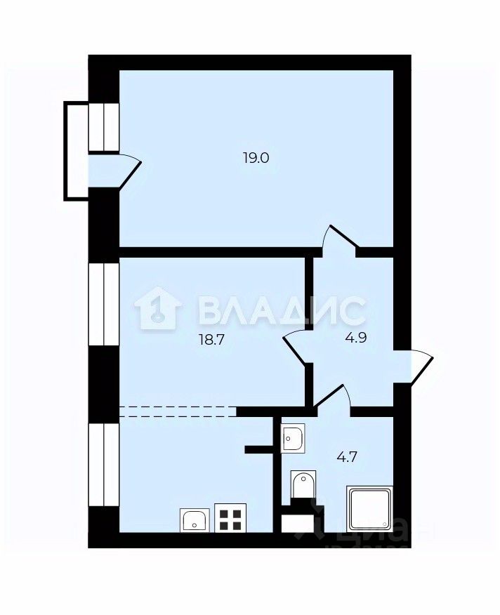 Общая площадь составляет 47.3 кв. м, из которых 19 кв. м - жилая
