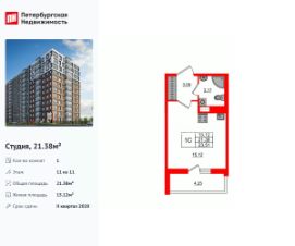 Удобная, классическая, функциональная европланировка, вместительная прихожая 3.09 м². Общая площадь студии - 21.38 м², жилая 15.12 м², высота потолка 3 м.