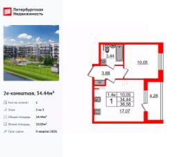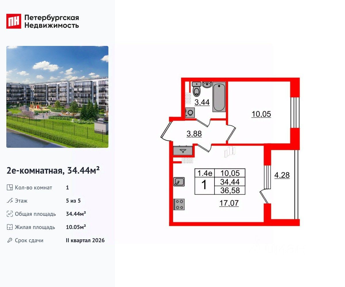 Удобная, классическая, функциональная европланировка, большая кухня-гостиная 17.07 м², вместительная прихожая 3.88 м². Общая площадь квартиры - 34.44 м², жилая 10.05 м², высота потолка 3.07 м.