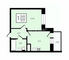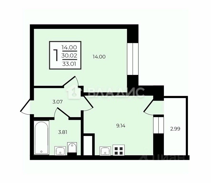 Квартира расположена на третьем этаже современного 22-этажного дома, построенного в 2018 году. Общая площадь — 29,5 кв. м, высота потолков — 2,7 м. Жилая площадь — 14 кв. м, площадь кухни — 9,1 кв. м. Есть лоджия — отличное место для отдыха.