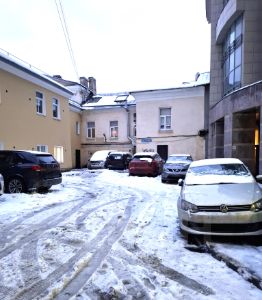 Закрытая территория двора, вход в парадную со двора. Консьерж на входе.