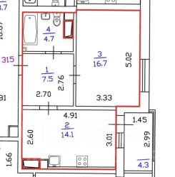 Общая площадь 47.3 (жилая плoщадь 43м2 и зacтeклённый бaлкoн 4,3м2).