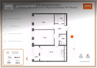 2х комнаная квартира. Расположена в секции 6.2 на 11 этаже. Высота потолка 2,8 м. Общая площадь 56,6 квм, площадь кухни 15,5 квм, площади комнат 13+13, лоджия 2,6 квм, 2 санузла 3,3 +2,4 квм.