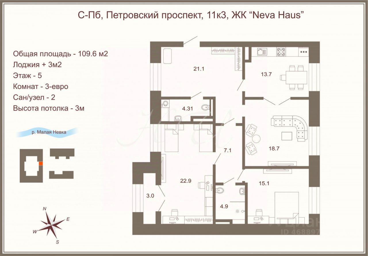 Квартира 109 м2 находится в третьем корпусе, одном из лучших в ЖК.