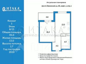 В квартире произведен качественный ремонт. Смонтирована кухня с бытовой техникой ( варочная панель, духовой шкаф, посудомойка), которая, как и мебель в комнате, остается покупателю. Функциональная планировка: комната 13 кв. метров с выходом на лоджию и просторная кухня 13 кв. метров, высота потолков 2.7 метров.