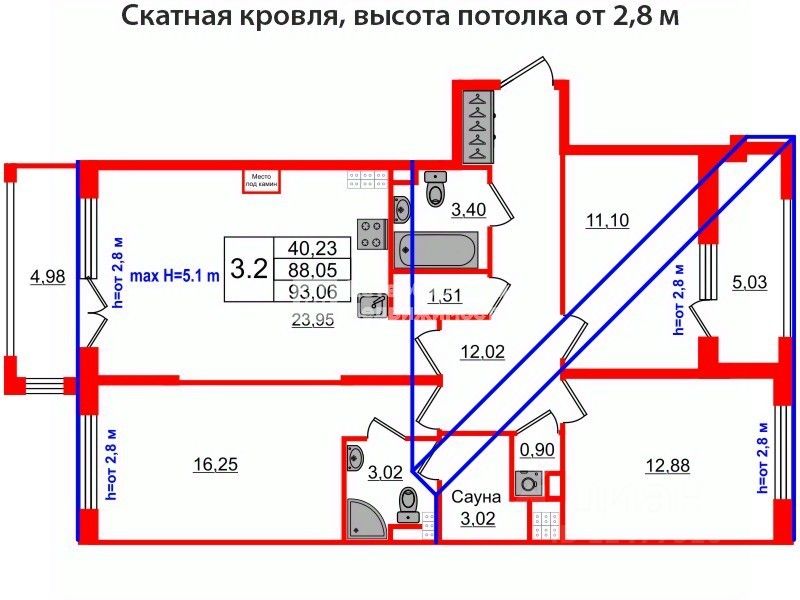 Площадь квартиры — 87,2 м2. Продуманная 4Е-квартира имеет удобную планировку: кухню-гостиную 23,95 м2 с панорамными окнами, остеклённую лоджию и вывод под камин , две комнаты 12.88м2 и 11.10м2, мастер - спальню 16.26м2 с собственным санулом и сауной 6.04 м2, прачечную 0.90 м2, кладовую 1.51 м2, гостевой санузел 3.40 м, вместительный коридор 10.99 м2.
