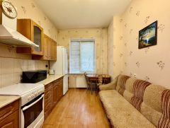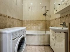 Общая площадь квартиры составляет 37,9 кв.м. Площадь кухни — 11 кв.м. Просторная комната площадью 18,5 кв.м. Санузел раздельный, полноценный, оборудован мебелью для ванной комнаты (тумба с раковиной, зеркало), установлен унитаз, стиральная машина и предусмотрено место для хранения вещей.