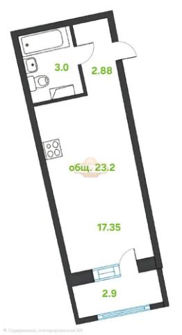 У квартиры удачная планировка: большая комната (17,35 кв м) с лоджией(2,9 кв м), санузел (3 кв м), прихожая ( 2,88 кв м).