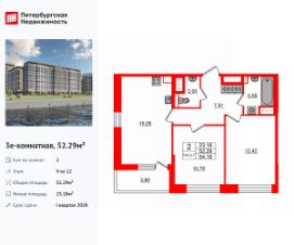 Удобная, классическая, функциональная европланировка, большая кухня-гостиная 16.05 м², вместительная прихожая 7.51 м². Общая площадь квартиры - 52.29 м², жилая 23.18 м², высота потолка 2.77 м.