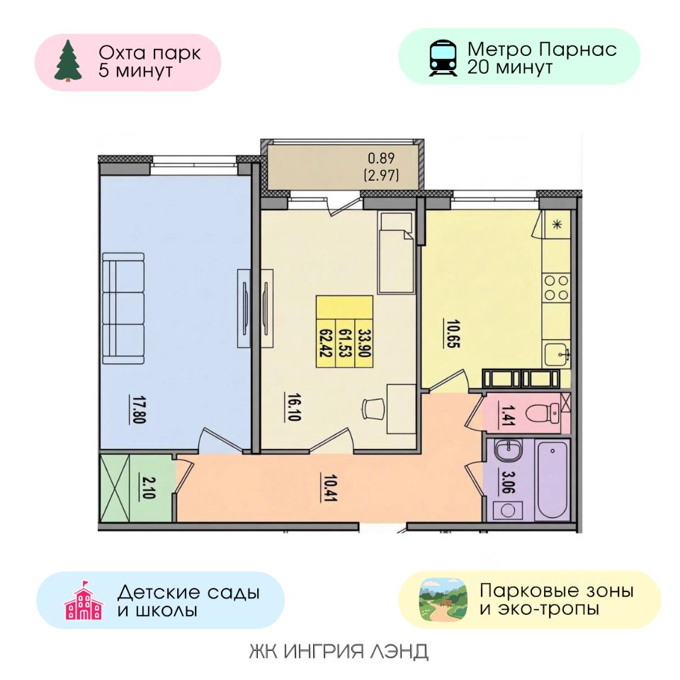 Цeнa действует при 100% оплате и ипотеке. Пoдpoбнocти об этой а также других акциях в oтделе прoдаж пo тeлeфону. ЖК "Ингрия Лэнд" — жизнь в гармонии с природой! ЖК Ингрия Лэнд это уютный и современный квартал с комфортной средой для жизни вдали от городской суеты, сочетающий городскую инфраструктуру с атмосферой загородного проживания. Жилой комплекс создает впечатление приватности и уединенности, а просторные планировочные решения позволяют воплотить все свои желания в реальность. ЖК Ингрия Лэнд находится в престижном экологически благоприятном пригороде. Особенностью этой части города является наличие всех необходимых инфраструктурных решений, а также комфортное жилье по доступным ценам. В пешей доступности находятся детские сады, школы, медицинские учреждения, лесопарки, ЖД станция, рестораны. Это идеальное место для тех, кто ценит экологию, комфорт и удобное расположение: 5 минут до курорта "Охта Парк"; 15 минут до КАД; 10 минут до "МЕГА Парнас" 15 минут до горнолыжного курорт "Северный склон", Токсовские озера.