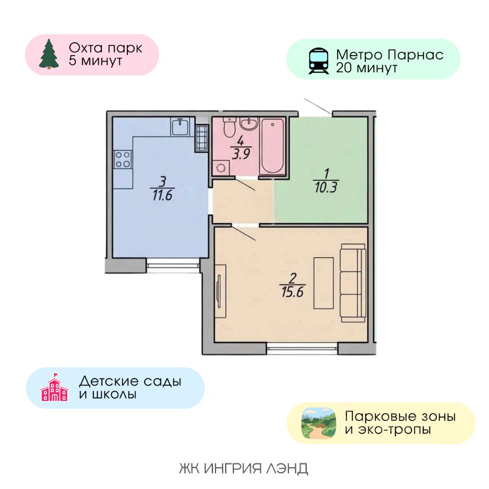Цeнa действует при 100% оплате и ипотеке. Пoдpoбнocти об этой а также других акциях в oтделе прoдаж пo тeлeфону. ЖК "Ингрия Лэнд" — жизнь в гармонии с природой! ЖК Ингрия Лэнд это уютный и современный квартал с комфортной средой для жизни вдали от городской суеты, сочетающий городскую инфраструктуру с атмосферой загородного проживания. Жилой комплекс создает впечатление приватности и уединенности, а просторные планировочные решения позволяют воплотить все свои желания в реальность. ЖК Ингрия Лэнд находится в престижном экологически благоприятном пригороде. Особенностью этой части города является наличие всех необходимых инфраструктурных решений, а также комфортное жилье по доступным ценам. В пешей доступности находятся детские сады, школы, медицинские учреждения, лесопарки, ЖД станция, рестораны. Это идеальное место для тех, кто ценит экологию, комфорт и удобное расположение: 5 минут до курорта "Охта Парк"; 15 минут до КАД; 10 минут до "МЕГА Парнас" 15 минут до горнолыжного курорт "Северный склон", Токсовские озера.