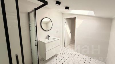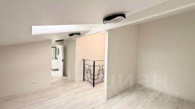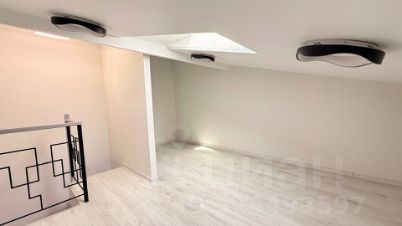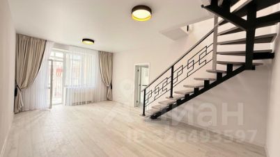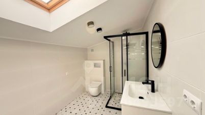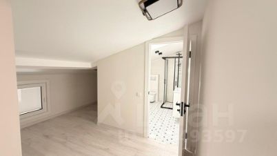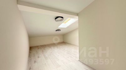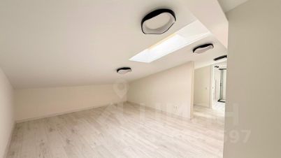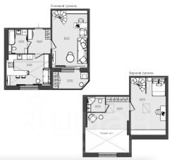Планировка включает в себя кухню, гостиную, лоджию, санузел и спальню с гардеробной и санузлом на мансардном этаже.