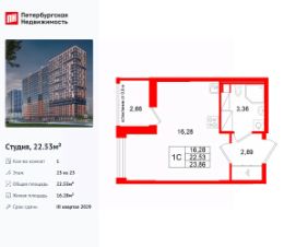 Удобная, классическая, функциональная европланировка, вместительная прихожая 2.89 м². Общая площадь студии - 22.53 м², жилая 16.28 м², высота потолка 3 м.
