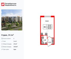Удобная, классическая, функциональная европланировка, вместительная прихожая 2.93 м². Общая площадь студии - 24.1 м², жилая 18.02 м², высота потолка 2.77 м.