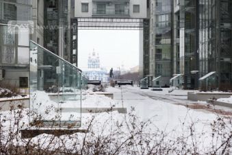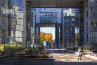 Комплекс образует небольшой обособленный охраняемый квартал с собственной закрытой внутренней территорией, расположен на пандусе (внутри находится паркинг) на высоте двух метров, Двор без машин.