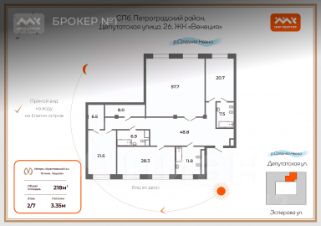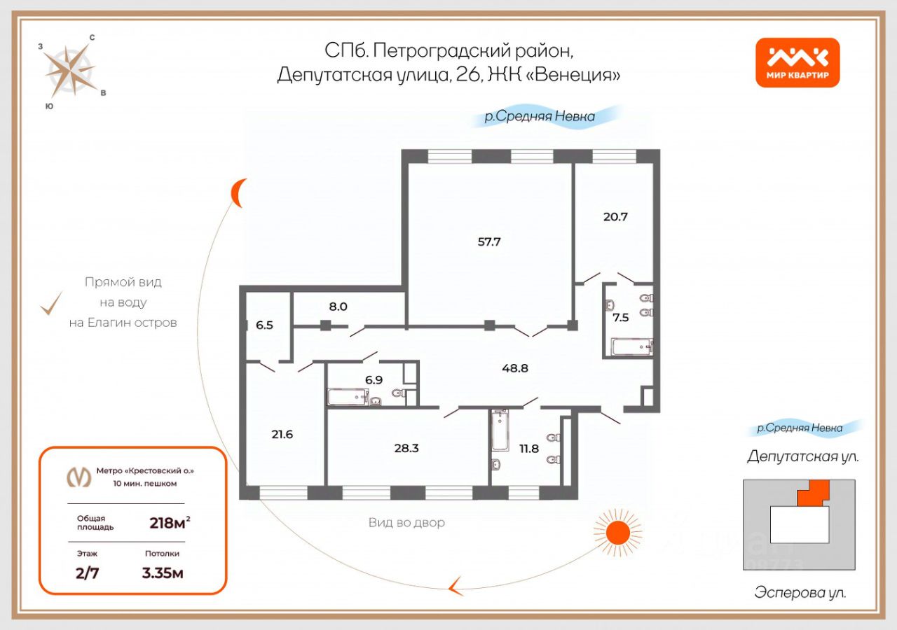 Двусторонняя квартира площадью 218 кв.м расположена на втором этаже и обращена своими окнами на набережную Средней Невки, с которой открывается панорамный вид на Елагин остров. Окна спальни и ванной комнаты выходят во благоустроенный двор-атриум , который накрыт стеклянным куполом.
