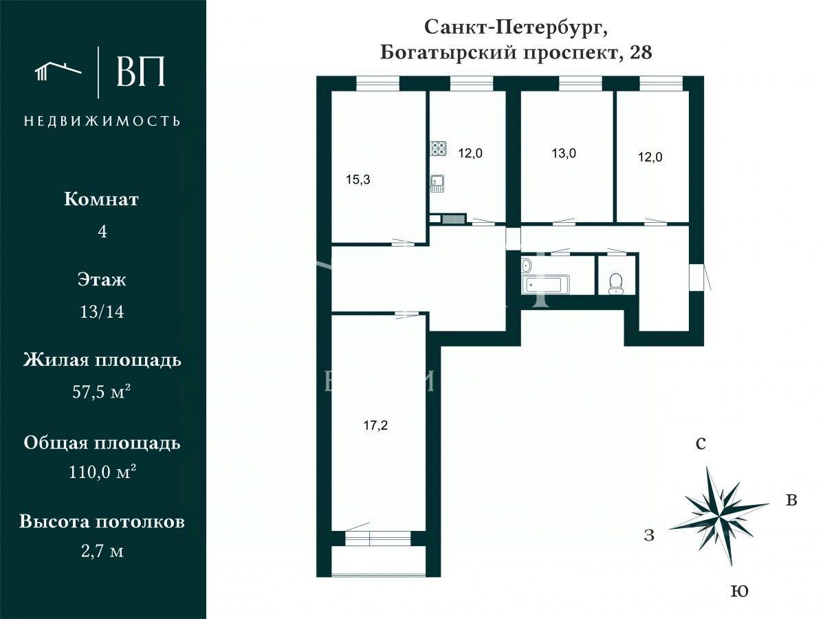 В продаже ПРОСТОРНАЯ 4-комнатная квартира 110 м2 со свежим ремонтом, мебелью и техникой полностью готова к проживанию! Квартира расположена в Современном кирпичном доме 2000 г.п. на ул. Богатырский проспект 28. Отличная транспортная доступность! В пешей доступности 2 станции метро Комендантский проспект и Старая деревня, с Богатырского проспекта выезд на ЗСД. До парка ЦПКИО 20 минут пешком, до парка 300-летия Санкт-Петербурга и Лахта Центра 10 мин. на транспорте. Рядом много школ и детских садов.