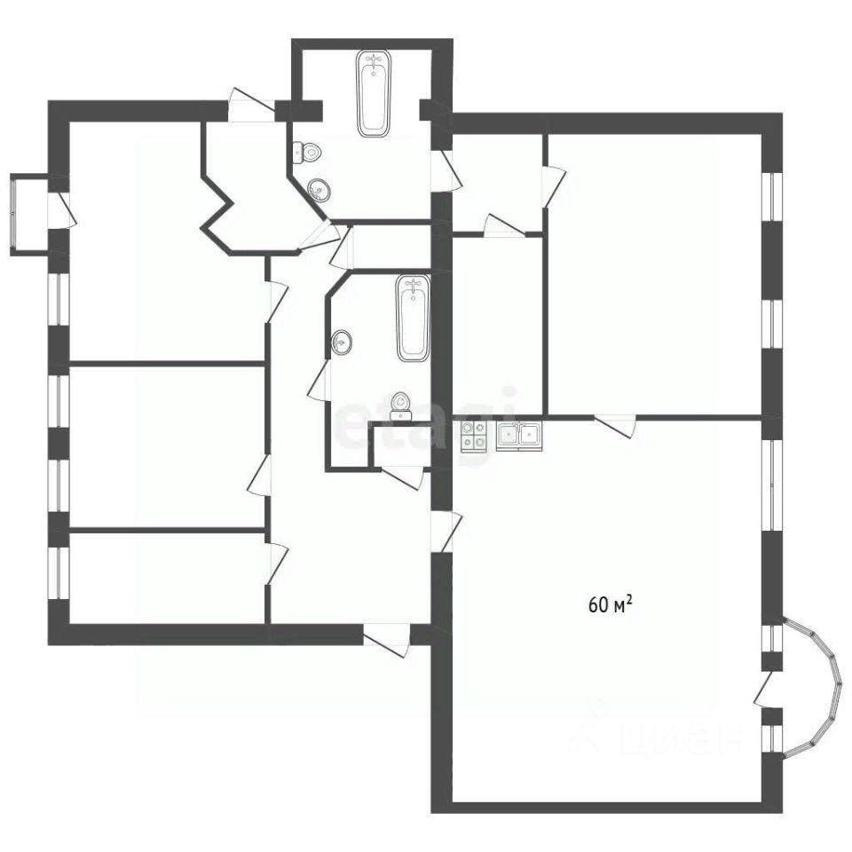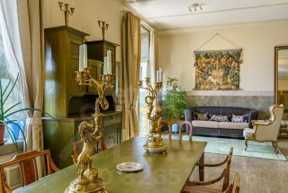 Планировка включает пять изолированных комнат, гардеробную, два санузла и два балкона — парадный с видом на исторический центр и задний, выходящий во двор.