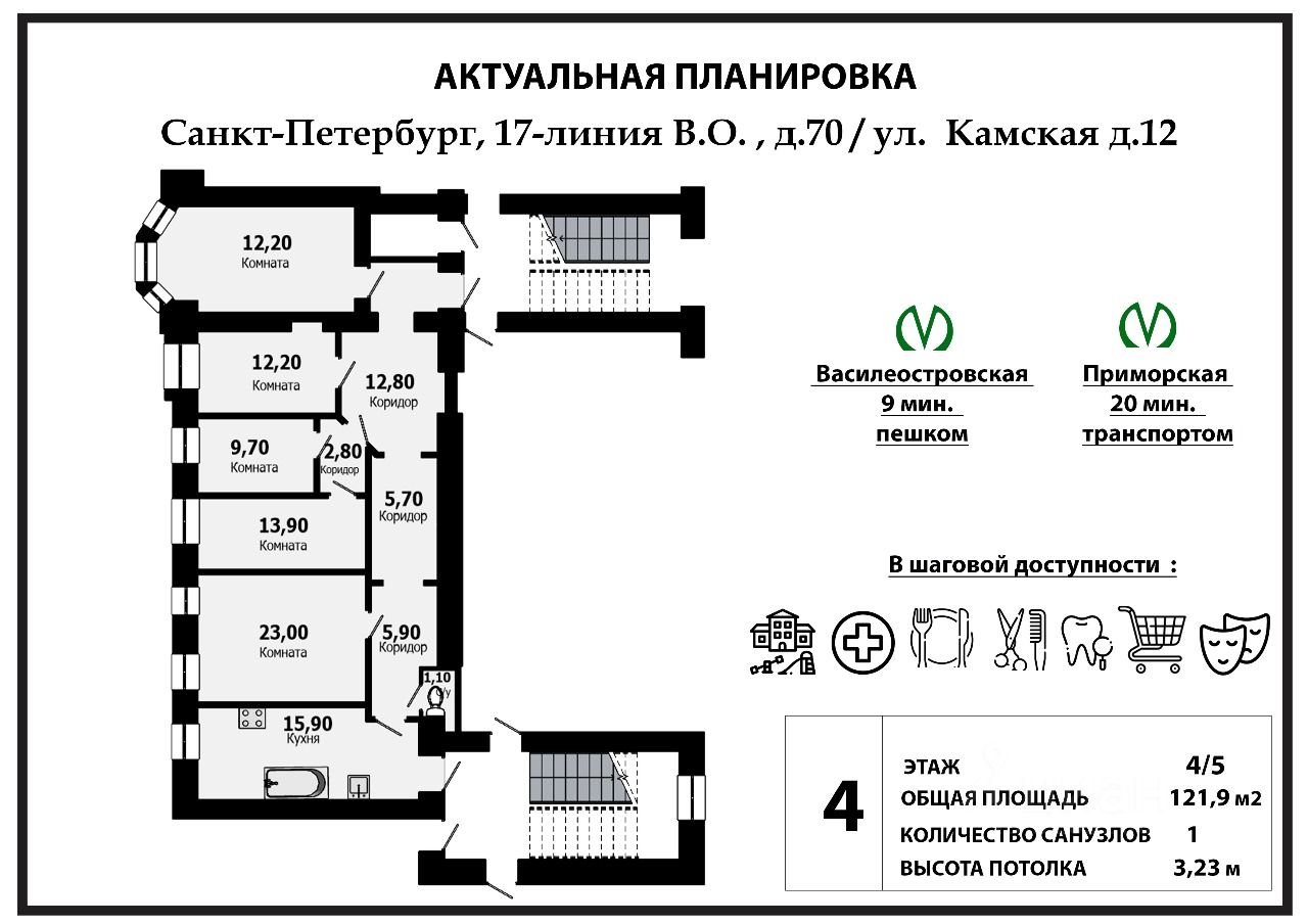 Квартира общей площадью 122 кв.м, потолками 3,23 м расположена на 4 этаже пятиэтажного дома. Обращена на 17 линию и смотрит на перспективу реки Смоленки и зеленого двора противоположного дома. Окна направлены на 17 линию и зеленый сквер.
