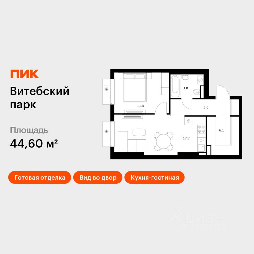 Продаётся 1-комн. квартира площадью 44,6 кв.м на 12 этаже 12 этажного дома (Корпус 6, Секция 3) проекта ПИК Витебский парк. Светлый просторный подъезд на уровне земли, функциональная планировка, большие окна, c отделкой.