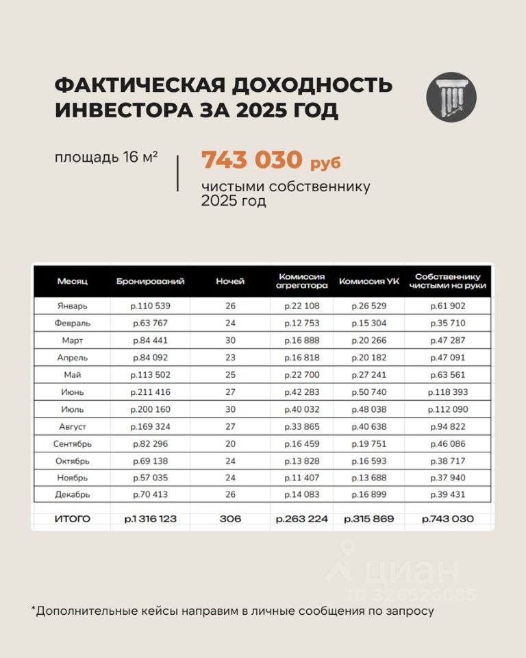 - Средняя фактическая доходность 1 026 000 р - 1 510 000 р (закрытая аналитика компании за 2025 год) без учета капитализации актива