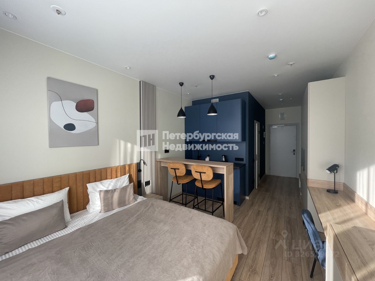 -полное оснащение: оборудованная модульная кухня с барной стойкой и техникой, спальная зона с кроватью и ортопедическим матрасом, комфортная зона рабочего места, современный просторный санузел в дизайнерском стиле и с техникой.