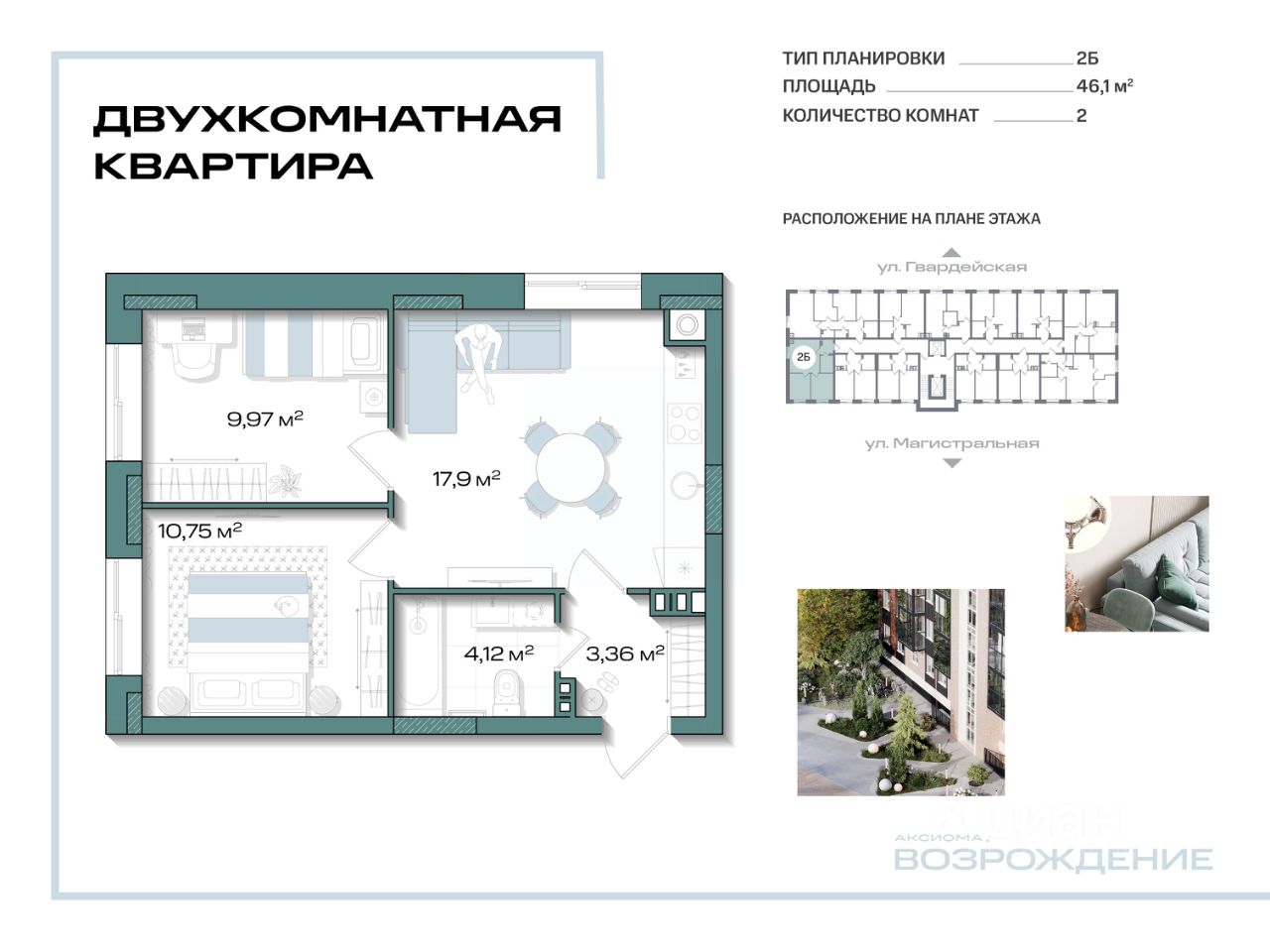 Продаётся 2-комнатная квартира в строящемся доме (Дом 6), срок сдачи: I-кв. 2028, общей площадью 46.1 кв.м., на 2 этаже. Новый клубный дом "Аксиома.Возрождение" от застройщика "Аксиома" расположен по адресу: г. Кировск, ул. Красных Сосен, 6