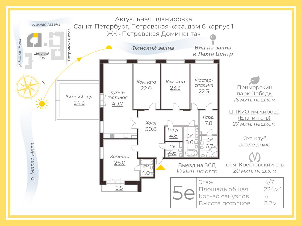 В квартире есть изюминка -зимний сад с панорамными окнами на воду. Четыре санузла.