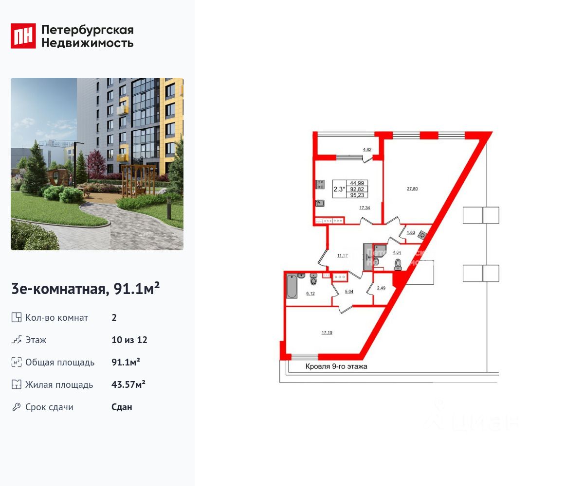 Удобная, классическая, функциональная европланировка, большая кухня-гостиная 17.17 м², просторная прихожая 16.21 м². Общая площадь квартиры - 91.1 м², жилая 43.57 м², высота потолка 2.77 м.