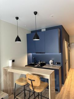 - Апартамент: площадью 24,1 м2 полностью обустроен мебелью и техникой, имеет комфортное зонирование: кухонная зона: с варочной панелью, вытяжкой и мини холодильником; зона отдыха: с кроватью и удобным матрацем; рабочая зона; просторный санузел с душевой кабиной и прихожая с местами хранения;