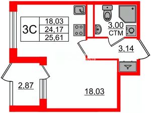 Квартира площадью 24,17 м кв и лоджия 2,78 м кв, комната 18,03 м кв, в прихожей есть гардеробная. Юго-западная сторона. Отделка NORD LINE SILVER.